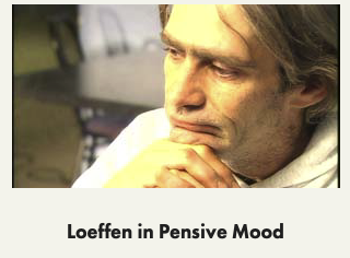 The camera then cuts to an exterior long shot of front of the cabin. Loeffen exits the cabin into the fresh morning air. The camera cuts back to the inside of the cabin, showing us a sequence of close-up shots: a rusted oven, a hanging bunch of tattered old socks, an unused cup, an oil lamp, a dirt filled floor. The cabin now looks as if it has been abandoned for years. The stranger is nowhere to be seen. Loeffen seems nonplussed by the bizarre and unexplainable event which has just transpired. We can make what we will of this scene: Was this Loeffen’s dream or hallucination? Or a fantasy nurtured by his desire for human companion? Or did Loeffen have a brief encounter with a ghost? Loeffen walks away from the cabin. The scene cuts to the camera in the woods, with Loeffen on frame left in long shot walking toward the foreground. The whole left side of the frame seems oddly distorted, as if a mirror image. Before we can reorient our perceptual focus, a ‘second’ Loeffen enters the right frame in foreground, staring at his ‘other’ image. Surprised by this oddly metaphysical confrontation, Loeffen turns to look back at the off-screen cabin, as if it contains an answer to the mystery. The image freeze frames and the film ends.