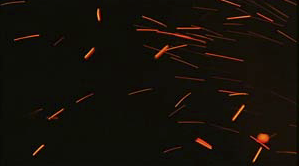 The last time this repeated scene occurs leads to the film’s enigmatic final scenes. With his car stranded, Loeffen and his dog walk off in search of help. Loeffen builds a fire for warmth. While the fire burns, the smouldering flames flicker off into the night sky. As the camera tilts to follow them the image turns to slow motion. The visual effect of the red flames burning and streaking against the dark night background recalls a Norman McLaren hand painted or scratched-on film.