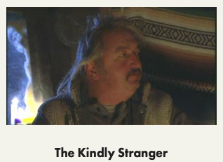 Continuing their walk, Loeffen comes across a small cabin with a warm, welcoming light shining within. Loeffen first knocks on the door, and when no one responds, opens the unlocked door and enters into the cosy confines of a lived-in cabin, with an inviting fire burning in an old wood oven. Loeffen maintains a running conversation with Blackie, wondering who might live in the cabin and whether they would be angry to find him inside. Loeffen’s queries are answered when a large Native looking man enters the cabin (the actor is Serbian, Ljubo Bakic). Loeffen excuses himself for entering the cabin without permission, but the stranger replies with unsettling kindness: “No need to apologize. I was kinda expecting you anyway. I just had a hunch. That’s why I left the cabin, to go look for you.” Much of their conversation resonates with import, such as the casual line delivered by the stranger, “It’s hard to tell what’s real and what isn’t after you’ve been out here a long time,” a clue to the viewer to question appearance and reality. He invites Loeffen to a fresh wine-fried steak and they continue talking and drinking wine. One of my favourite lines comes near the end of this cabin scene, when Loeffen talks to Blackie about the stranger while he has slipped out of the cabin for the steak: “I’m kind of nervous..is he being nice or is he being weird!”