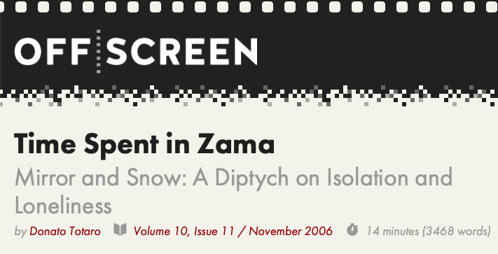 The final shot of the film also reminds me of a parable cited by the Iranian director Mohsen Makhmalbaf in a piece he wrote called “Mirror Images.” In the piece Makhmalbaf quotes a famous Iranian parable: “There is a parable that the fact was a mirror in God’s hand but it broke. People picked up the broken pieces and each one saw his reflection in it, each thought that he had held the fact, that he alone knew the reality.” 3 This parable, a Middle Eastern version of Plato’s “The Cave,” also sheds some light on the final shot of Snow. Coming out of the surreal meeting with the stranger in the cabin, Loeffen (and the viewer) can no longer trust what he sees. Reality has become an illusion. Echoing the Turkish poet Veli, Loeffen “runs to the mirror…longing for a soul,” but this encounter with his mirrored self is also a reminder that as long as he lives “in the state of mind of Zama,” he can not ‘know reality.’ What he sees around him, like the deer on the road, the stranger in the cabin, the self-reflection in the woods, are like the ‘broken pieces’ of the mirror.
